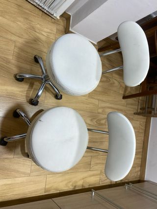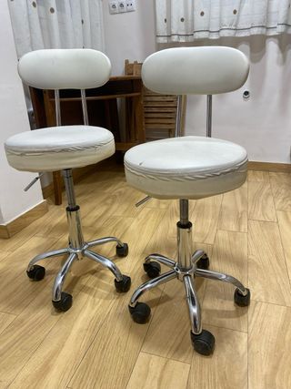 Conjunto de dos taburetes con ruedas, ideales para diversos usos. - Asiento y respaldo acolchados. - Base estable con ruedas. - Diseño moderno y funcional.