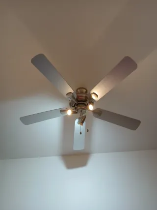 Ventilador de techo con aspas metálicas y detalles en plástico. - Diseño de cinco aspas. - Acabado en color plata y gris.