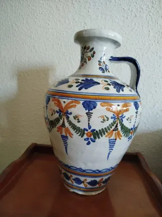 Precioso jarrón de cerámica con un diseño floral pintado a mano. Su tamaño lo hace ideal para decorar cualquier rincón. - Altura aproximada de 25 cm. - Decoración con motivos florales en varios colores. - Asas laterales. - Borde superior decorado con un patrón azul.