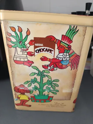 Bonita caja metálica de Chocapic de Nestle con un diseño inspirado en arte precolombino. Ideal para coleccionistas o para guardar objetos.Recoger en Alcorcon - Diseño con figuras y motivos aztecas. - Ilustración de un árbol de cacao. - Texto Para Mi Arbol más Bonito del Mundo es el Arbol del Cacao.