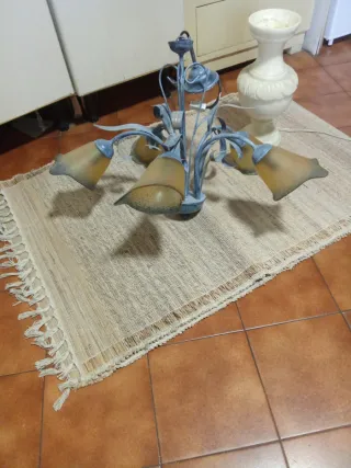 Elegante lámpara de forja con cinco brazos y tulipas de cristal.58x38 - Diseño floral. - Acabado en gris azulado y tulipas caramelo