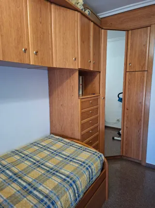 Se vende dormitorio completo con dos camas de 90 cm -Madera y estructura en perfectas condiciones. -Se incluyen colchones, fundas, sábanas y colchas. - Armario de madera de cuatro puertas y cajones. - Mesilla con estanterías. No envío, recogida en domicilio. Se puede ver sin compromiso.
