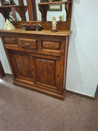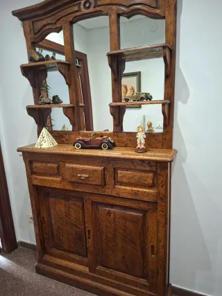 Mueble recibidor de madera maciza de roble con un ancho de 120 cm. Cuenta con un espejo integrado y varios estantes para exhibir objetos. - Diseño clásico y robusto. - Amplio espacio de almacenamiento con puertas inferiores. - Cajones superiores para organización.