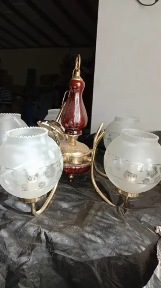 Elegante lámpara de techo con un diseño colgante. - Acabado en tono dorado. - Globos de cristal esmerilado con detalles florales. - Elementos decorativos en color burdeos.