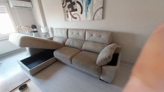 Sofá chaise longue de tela en color beige. Cuenta con dos espacios de almacenamiento. - Diseño moderno y funcional. - Cojines mullidos para mayor comodidad. - Chaise longue reversible.