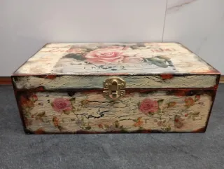 Preciosa caja de madera con un estilo Shabby Chic, perfecta para añadir un toque artesanal a tu hogar. - Diseño floral con rosas. - Acabado envejecido y texturizado. - Detalle de cierre metálico dorado. Decoración interior con flor de decoupage y mariposas de pasta fría. En mi perfil encontrarás más artesania, toda hecha por mi. Envío por correos.