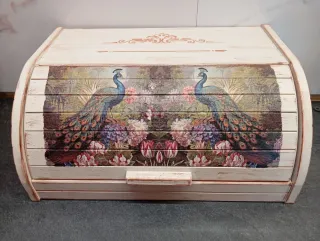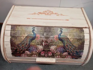 Panera de madera con un diseño artesanal único, decorada con pavos reales y flores. - Diseño de pavos reales y flores. - Acabado envejecido con detalles en color óxido. - Tapa enrollable.. Envío por correos.