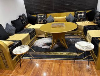 Conjunto de salón de estilo marroquí con un diseño elegante. - Tapicería en tela. - Estructura de madera. - Combinación de colores negro y dorado.