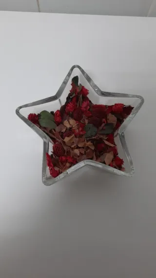 Precioso jarrón con forma de estrella, lleno de flores secas y hojas en tonos rojos y marrones. - Diseño original en forma de estrella. - Contiene una mezcla de flores y hojas secas. - Aporta un toque decorativo natural.