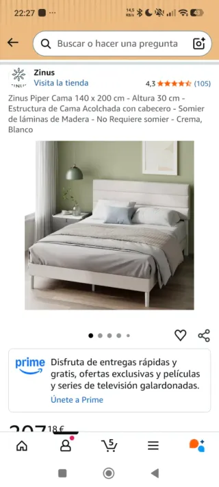 Cama Zinus Piper de 140 x 200 cm con estructura acolchada y cabecero. - Altura de 30 cm. - Somier de láminas de madera. - No requiere somier adicional. - Color crema y blanco.