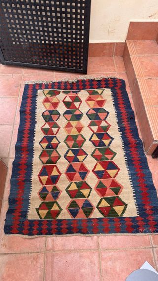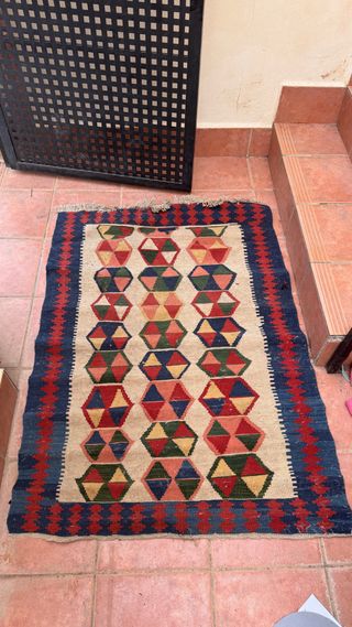 Esta alfombra persa antigua es una pieza única con un diseño intrincado y colores vibrantes.. Como se puede ver las imágenes no ha pedido el color ya que se ve preciosa. Se utilizó poco y estuvo guardada. Le hace falta un poco de limpieza. -Medidas: 2,10m x 1,32m - Hecha de lana de alta calidad. - Tonos predominantes de rojo y azul. - Diseño tradicional persa.. Si tienes alguna duda te ayudaré a resolverlas. A parte de ser una alfombra preciosa y de calidad su tamaño es ideal para ponerla enfrente del sofá y que le dará a la estancia un toque de elegancia.