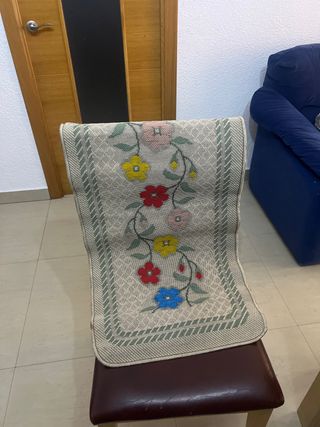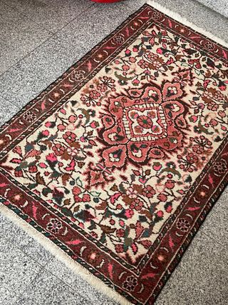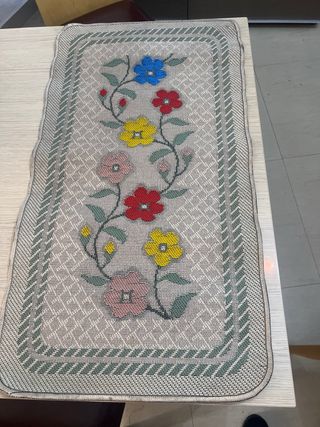 Alfombra artesanal de lana de oveja 100% con un bonito diseño floral. Suave, con doble capa termica muy calida. Filos bien rematados. Mide 90x1'30. Pesa 1'500kg. Muy decorativa y combinable. Multiusos. Fabricada en Alemania. Antigua. Limpia y buen conservada. 49€. Recoger en Marbella. Hago envio.