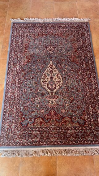 Alfombra de tela con un diseño clásico y elegante. ES antigua, calidad irán. HAce años que no la usamos pero la saco a airear cada verano, pequeña mancha, casi no se aprecia, en una esquina - Medidas: 160x230 cm. - Tonos tierra que combinan fácilmente.