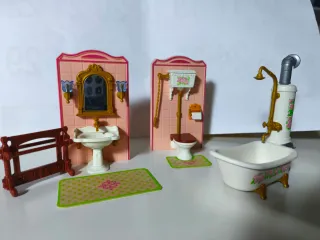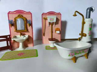 Conjunto de muebles para baño de estilo antiguo de Playmobil. - Incluye lavabo con espejo y apliques. - Incluye cisterna de inodoro con cadena y portarrollos. - Incluye bañera con patas y ducha. - Alfombras decorativas.