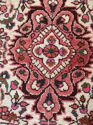 Antigua alfombra de estilo clásico iraní, con un maravilloso diseño intrincado y colores vibrantes y vivos. Esta en condicion vintage, es muy antigua y tiene signos de desgaste como se puede ver en las fotos. El color y los flecos estan en buen estado. Hecha en lana 100 por 100. Mide 130x70