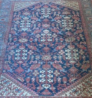 Hermosa alfombra persa antigua, una pieza única con un diseño intrincado. - Elaborada con lana de alta calidad. - Tonos predominantes de azul y rojo que aportan calidez. - Ideal para añadir un toque de elegancia a cualquier espacio.
