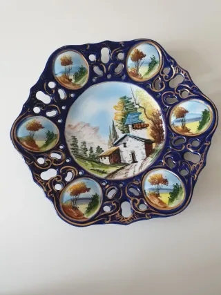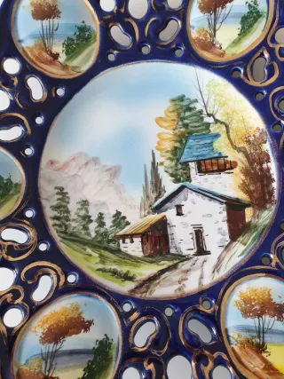Precioso plato de porcelana antigua Alcobenda Portugal, con un diseño encantador. Ideal para coleccionistas o amantes de piezas únicas. Diámetro 37cm. Numerado 887 - Pintado a mano con escenas campestres. - Bordes con detalles dorados. - Forma octogonal con detalles calados. zarahome hm nórdico decoración salón comedor ikea cocina vajillas vintage flores soulvintage mesa cubertería bronce dorado navidad otoño regalo Sargadelos artesanía alfombras cristal de Bohemia porcelana bidasoa colecciones antiguo antigüedades lienzo cerámica gallega