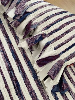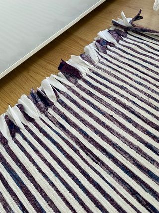 Alfombra de tela con un diseño de rayas en morado y blanco. Sus medidas son 118x148 cm. - Diseño de rayas verticales. - Textura tejida Nuevo, nunca usado