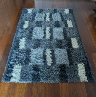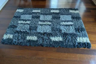 Skuggsvingel es una alfombra tejida a mano de IKEA con un diseño único. Está inspirada en redes de pesca y ondas abstractas, creando un efecto 3D mediante la combinación de superficies lisas y pelos cortos de diferentes alturas. Está hecha de lana (62 % lana, 38 % viscosa/rayón en la parte superior, 100 % algodón en la base), es resistente a las manchas, duradera y apta para calefacción por suelo radiante. Compramos dos, pero la segunda no cabía en la habitación, así que la vendemos. Compramos una nueva por 499 €.