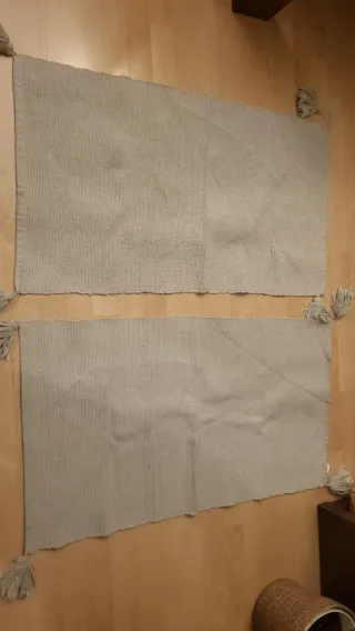 Dos alfombras de tela con flecos decorativos Ikea. Medidas 91x51cm - Diseño moderno en tonos verde y gris. - Acabado con borlas en los extremos.