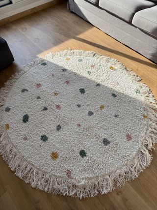 Alfombra redonda con un diseño divertido y alegre, perfecta para habitaciones infantiles. Su textura suave y los detalles de flecos le dan un toque acogedor. - Diseño de puntos multicolor. - Borde con flecos.