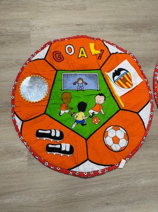Alfombra de actividades con temática de fútbol, ideal para el desarrollo sensorial con temática valencianista. - Diseño circular con motivos de fútbol. - Incluye elementos interactivos como un espejo y texturas. - Representación de un campo de fútbol con jugadores y portería. Dispongo de dos unidades. Si se quieren las dos, 8€ la pareja.