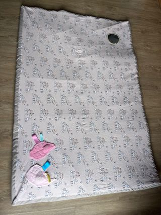 Alfombra de juegos con un diseño tierno y colorido, ideal para el entretenimiento de los más pequeños. Incluye un gimnasio con arcos y varios juguetes colgantes. - Base acolchada con estampado floral. - Figuras de nubes y elementos decorativos. - Arcos desmontables con colgantes. - Colores suaves y alegres. Perfecto estado.
