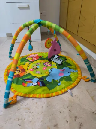 Manta de actividades para bebés con un diseño colorido y divertido. - Incluye arcos superiores con varios juguetes colgantes. - Estampado de animales y elementos de la naturaleza en la alfombra. - Bordes acolchados para mayor comodidad.