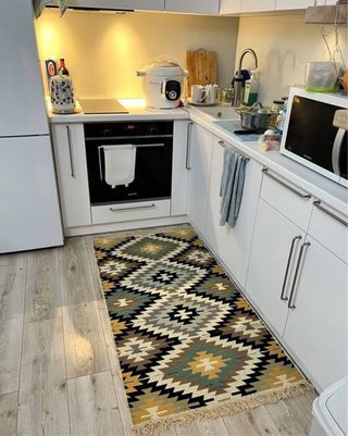 Alfombra de estilo étnico con diseño Kilim. Sus dimensiones son 80x150 cm. Esta alfombrilla se puede usar por ambos lados. Dimension: 80 ancho) x 150 (longitud) cm Composición: 100% Algodon Origen sostenible.: Si Lavable: Si Patrón: Geometrico Estilo: Étnico, Moderno