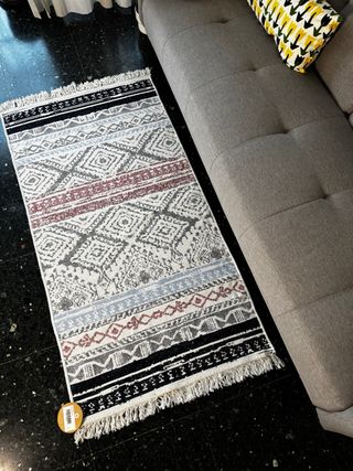 Alfombra de estilo étnico con un diseño geométrico y flecos. - Medidas: 80x150 cm. - Material: Algodón. Esta altombrilla se puede usar por ambos lados. Dimension: 80 (ancho) x 150 longitud) cm Composición: 100% Algodon.🌿