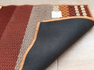 Alfombrilla mullida de tejido lana, para pies de cama. Detrás material goma anti-deslizamiento en suelo. Tonos marrones y mostazas. medida 68x43 cm En buen estado. cuidada. No es nueva.