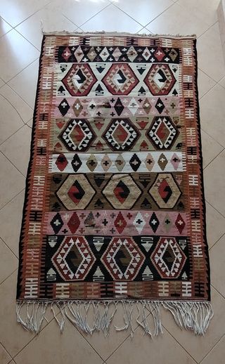 Preciosa alfombra kilim hecha a mano. Es una pieza única con un diseño tradicional. - Colores vibrantes y diseño llamativo. - Material de lana de excelente calidad. - Perfecta para añadir calidez y estilo a cualquier espacio.