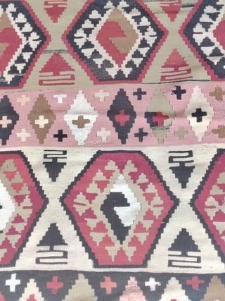 Preciosa alfombra kilim antigua, con certificado de autenticidad. Es una pieza única, ideal para añadir calidez y estilo a tu hogar. - Confeccionada en lana. - Presenta un diseño multicolor con patrones tradicionales. - Bordes deshilachados, que le dan un toque rústico.