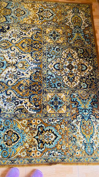 Solo envio impist gls Preciosa alfombra de estilo persa con un diseño intrincado y colores vibrantes. - Elaborada con lana de alta calidad. - Tonos predominantes de azul y rojo. - Patrones florales y geométricos. - Borde decorativo con flecos.