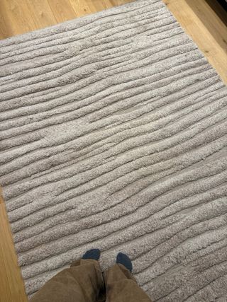 Skuggsvingel es una alfombra tejida a mano de IKEA con un diseño único. Está inspirada en redes de pesca y ondas abstractas, creando un efecto 3D mediante la combinación de superficies lisas y pelos cortos de diferentes alturas. Está hecha de lana (62 % lana, 38 % viscosa/rayón en la parte superior, 100 % algodón en la base), es resistente a las manchas, duradera y apta para calefacción por suelo radiante. Compramos dos, pero la segunda no cabía en la habitación, así que la vendemos. Compramos una nueva por 499 €.