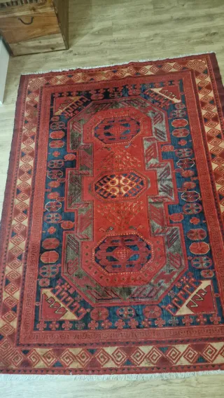 Vendo elegante alfombra de gran tamaño para salón o comedor, con diseño clásico de estilo oriental/persa. Detalles: Dimensiones: 240 cm x 170 cm (Tamaño estándar ideal para cubrir la zona de sofás o bajo una mesa de comedor de 6 sillas). Diseño: Patrón de medallón central con motivos florales intrincados (estilo Tabriz/Kashan). Colores: Fondo predominante en rojo granate/burdeos con detalles en azul marino, crema y beige. Muy sufrida (disimula muy bien el uso). Estado: En muy buen estado de conservación. Los colores se mantienen vivos y los flecos están completos y cuidados. Proviene de una casa de no fumadores.