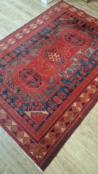 Alfombras de lana con un diseño tribal geométrico en tonos rojos y azules. Su tamaño la hace ideal para cualquier estancia. - Elaborada con lana de alta calidad. - Patrón geométrico intrincado. - Colores vibrantes y duraderos. 150 por separado 250 el lote completo. Necesitan limpieza ya que llevan tiempo guardadas. Negociable.