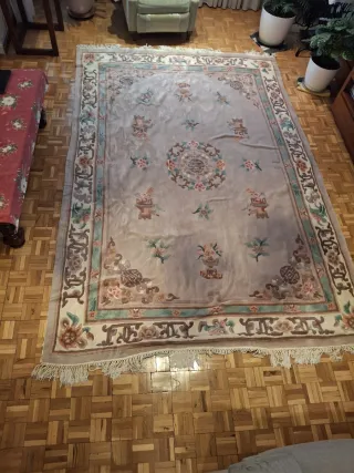 Alfombra de lana de gran tamaño con un diseño versátil y apto para diversos espacios. Se vende lavada, se recogió del tinte antes de ponerla a la venta. - Medidas: 3x2 metros. - Tonos beige y rosa. - Diseño con motivos florales y ornamentales. *** SE PUEDE RECOGER EN MADRID, ZONA VENTAS ***