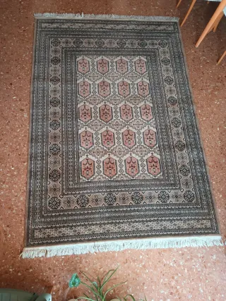 Preciosa alfombra pakistaní hecha a mano, con poco uso, no tiene ninguna marca de muebles, ni manchas. Por volumen y peso es solo para recoger en domicilio y se encuentra en la zona de Villamalea (Albacete) - Medidas: 2.20 metros de largo por 3.10 metros de ancho y un grosor de 3 cm - Material: Lana.