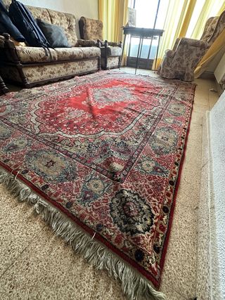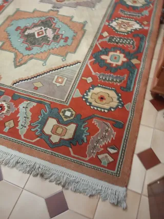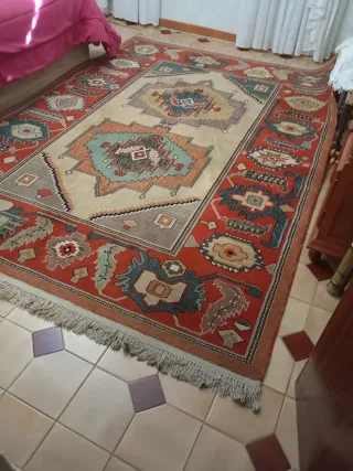 Se vende alfombra oriental de lana de 1,40x2,00m. Se compró a finales del año 2021. Es gruesa, aísla muy bien. Se entrega el certificado de autenticidad de procedencia oriental. Se compró por 420€ y se vende por 120€. Buen estado. A recoger en Santa Isabel (Zaragoza).