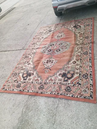 Alfombra con un diseño oriental y colores vibrantes. -Tiene varias manchas, ver fotos - Tonos predominantes de naranja y rosa. - Patrones intrincados en el diseño. - Borde decorativo. -Medidas 2,85x1,90 metros