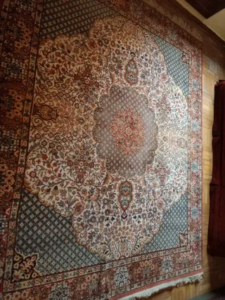 Alfombra de estilo Tabriz o Isfahán (persa), caracterizado por el medallón central floral y los motivos de "botas" o flores intrincadas con flecos en los extremos. Por el diseño de medallón central (estilo Persa/Kashan) y la textura del reverso es una alfombra de lana sobre base de algodón (es de los 80/90 y ha aguantado bien el color). El fleco está integrado y bien rematado, por lo que es de calidad.