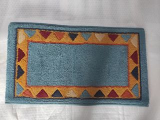 Alfombra pequeña. Medidas 60x35x1 cm. Color azul con estampación perimetral. En perfecto estado. Son dos (2) unidades. Precio 10€/por unidad.