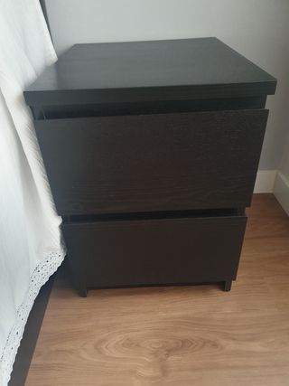 Conjunto habitación compusto por cabecero de polipiel, mesita y dos baldas. Color negro. De Ikea. Posibilidad vender por separado. Cabecero 160