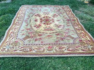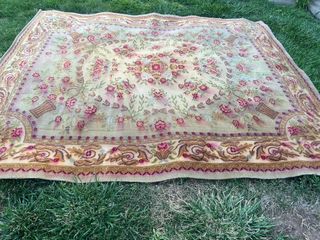 Alfombra de estilo Aubusson, tejida en China a mediados del siglo XX. Sus dimensiones son 205 cm de largo por 140 cm de ancho. - Lana sobre algodón. - Diseño floral y ornamental. - Tonos rosas y pasteles predominantes.