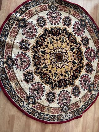 Elegante alfombra redonda con un diseño intrincado y colores cálidos, ideal para dar un toque especial a tu salón. - Diseño central tipo mandala. - Borde exterior en tono burdeos. - Patrones florales distribuidos en círculos concéntricos.