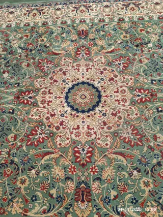 Elegante alfombra con un diseño intrincado y colores vibrantes. - Hecha de lana de alta calidad. - Patrón floral detallado en tonos verdes y multicolor. - Borde decorativo que realza su diseño.