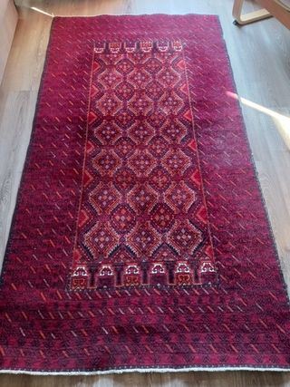 Preciosa alfombra roja de lana. Está en buen estado, con un diseño único y llamativo. - Perfecta para añadir calidez y estilo a tu hogar.