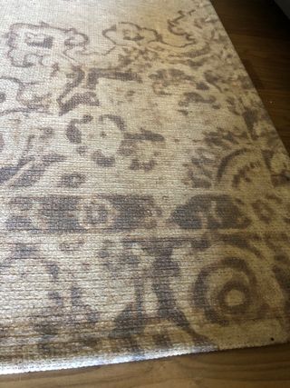 Alfombra de tela con un diseño moderno que combina tonos beige y grises. - Diseño abstracto. - Tacto suave. Presenta algunas manchas pero se pueden lavar.