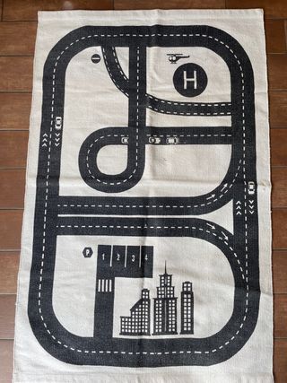 Alfombra de juego con diseño de circuito de coches y ciudad. - Diseño de carretera con curvas y rectas. - Incluye helipuerto con letra H. - Zona de aparcamiento con números 1, 2, 3, 4. - Representación de edificios de ciudad.